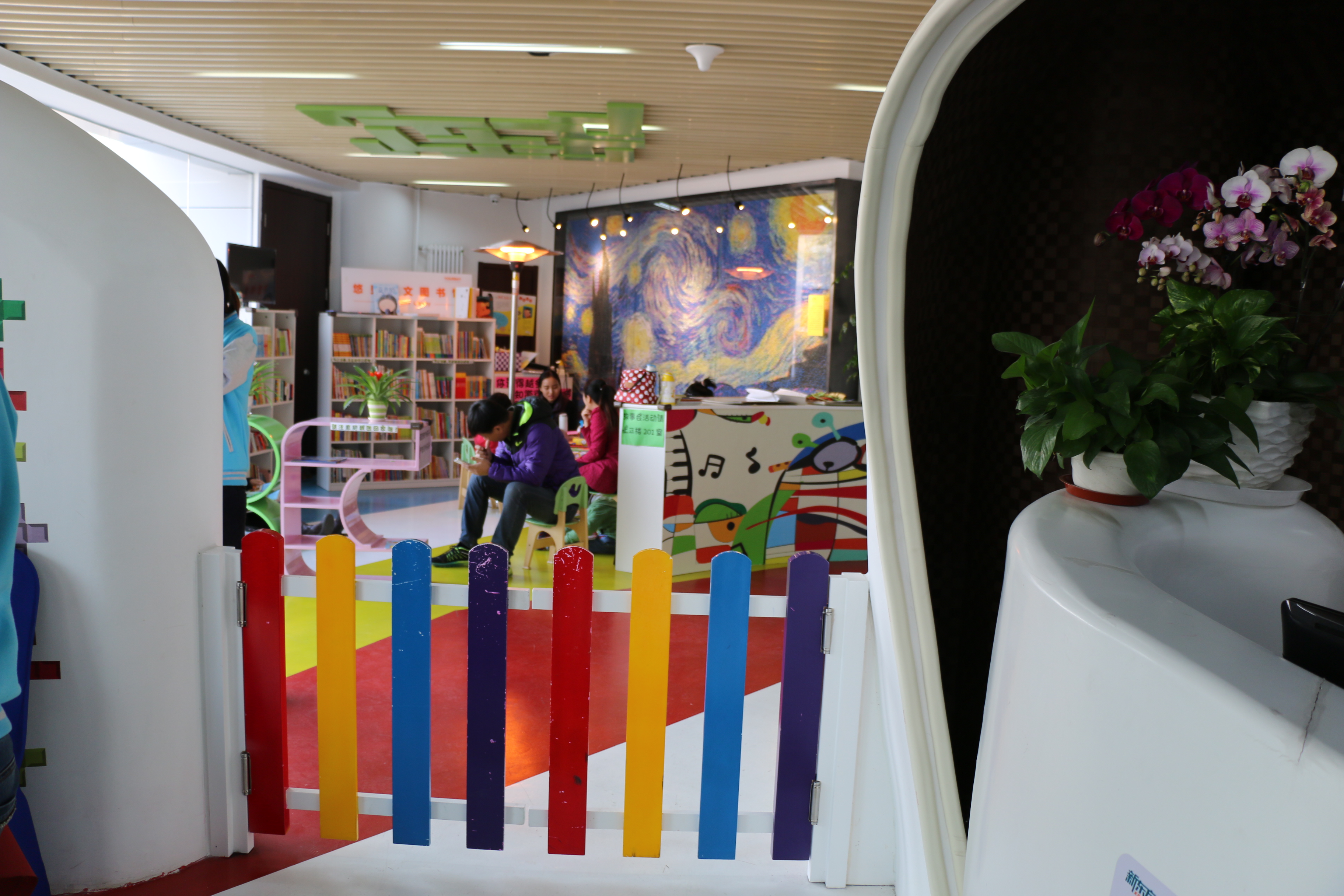 圖為一層左側(cè)的學(xué)員活動區(qū)和繪本閱讀區(qū),學(xué)員可以玩嘿哈科技的體感游戲,看繪本故事。