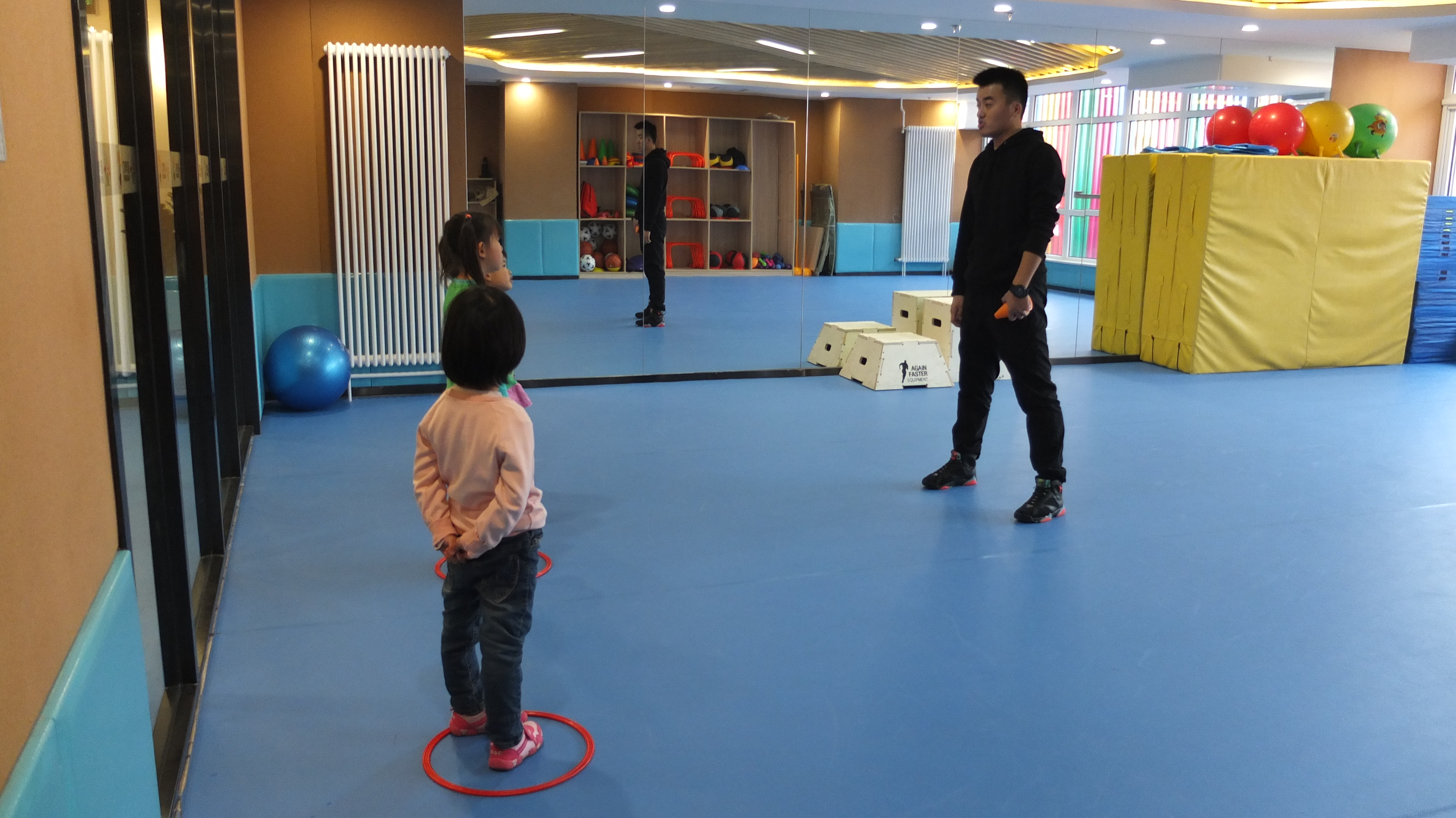 圖為少兒體能試聽課門口,參加試聽課的學(xué)員家長們站在教室門口觀察老師和孩子的上課表現(xiàn)。