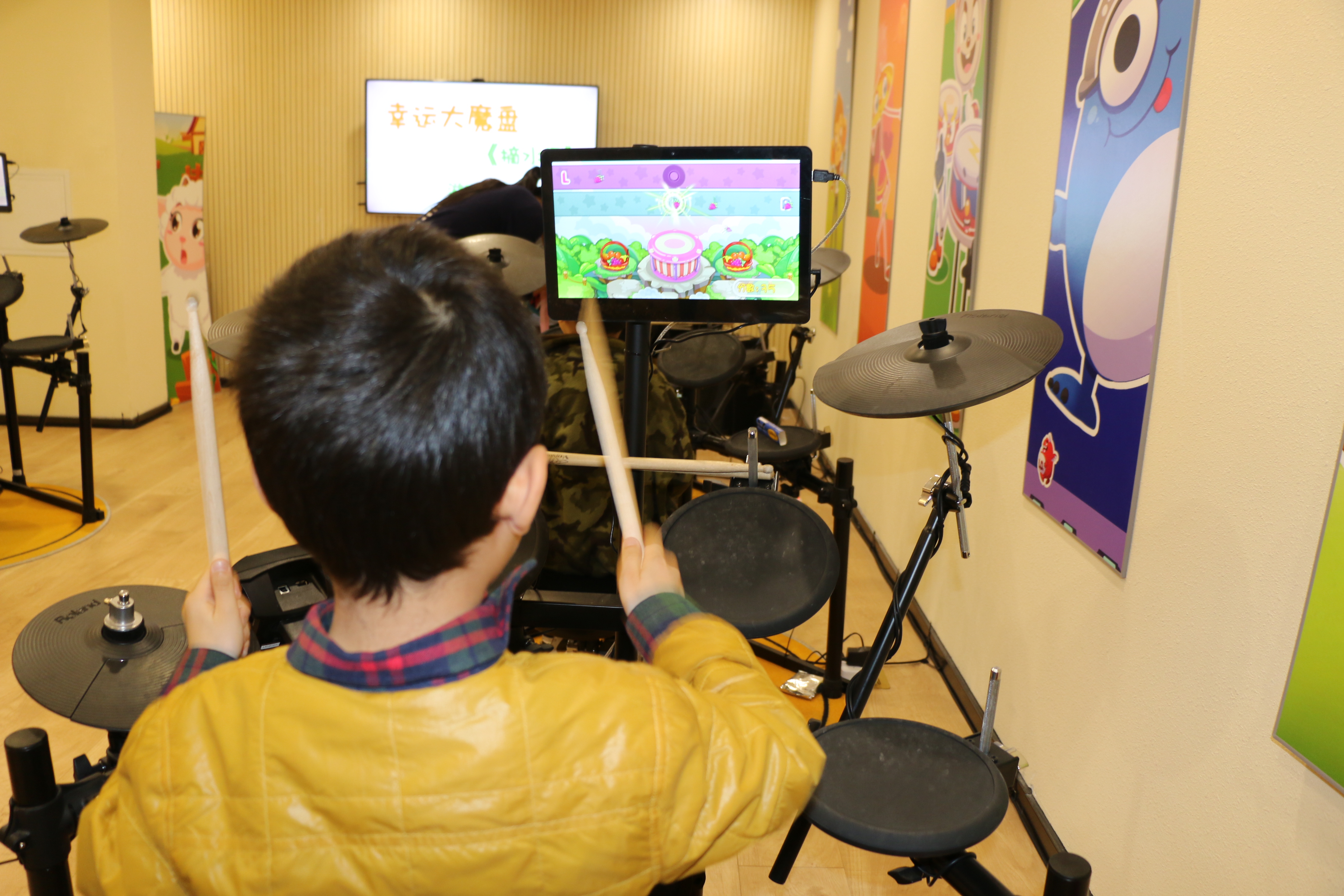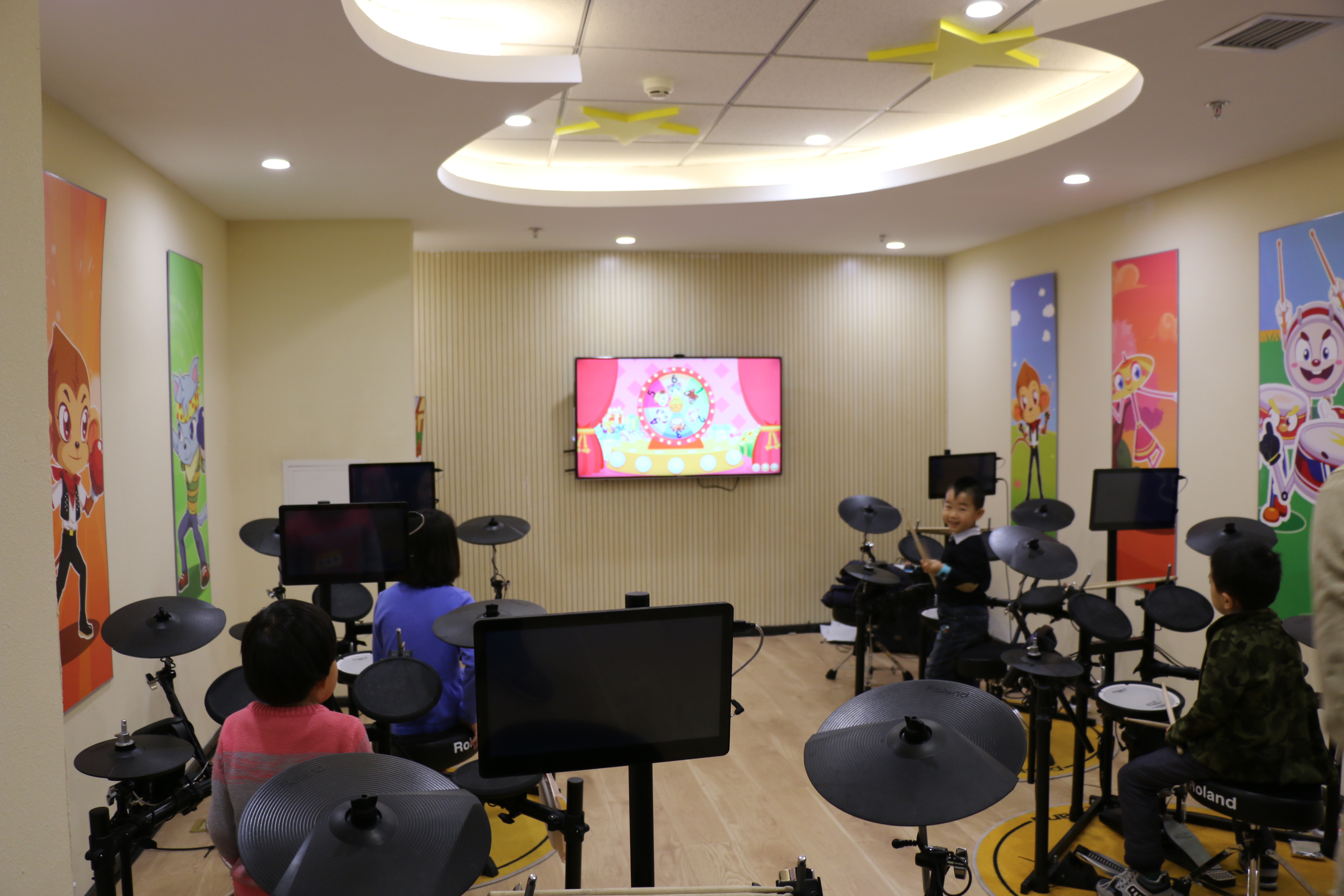 圖為爵士鼓課教師為小學(xué)員進行指導(dǎo)。每個學(xué)生面前的鼓架上都有一個顯示屏,與課堂中電視相連。