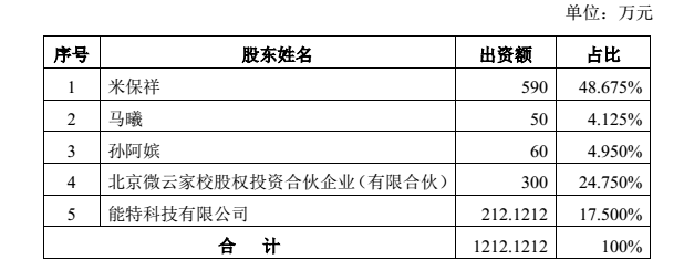 公告顯示,能特科技與微校教育及其原股東:米保祥、馬曦、孫阿嬪、北京微云家校股權(quán)投資合伙企業(yè)(有限合伙)簽署《北京微校教育科技有限公司投資協(xié)議》。另外,微校教育擬將注冊(cè)資本1000萬(wàn)元增至1212.1212萬(wàn)元,能特科技出資2500萬(wàn)元認(rèn)購(gòu)全部新增的注冊(cè)資本212.1212萬(wàn)元,即其中投資款212.1212萬(wàn)元計(jì)入注冊(cè)資本,2287.8788萬(wàn)元計(jì)入資本公積。本次增資完成后,微校教育股權(quán)結(jié)構(gòu)為: