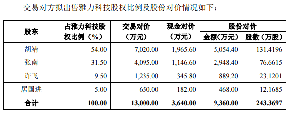 電光科技在公告中稱,公司擬通過向特定對象非公開發(fā)行股份和支付現(xiàn)金相結(jié)合的方式購買胡靖、張南、許飛、居國進(jìn)合計持有的雅力科技 100%的股權(quán)。其中:72%股權(quán)以發(fā)行股份支付對價,其余28%股權(quán)以現(xiàn)金支付對價。