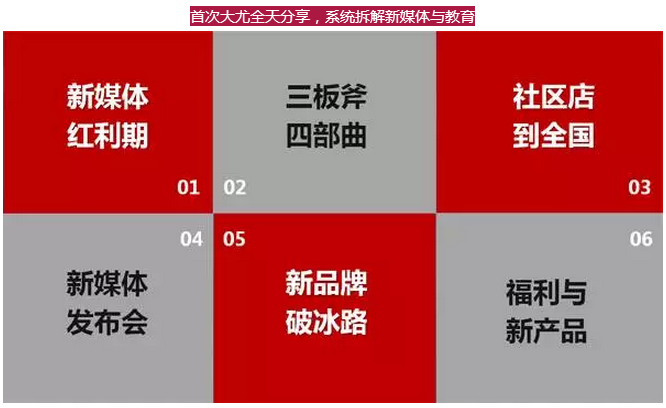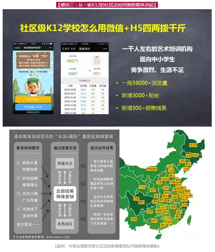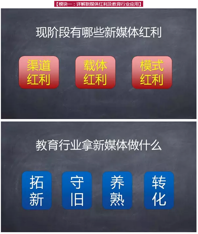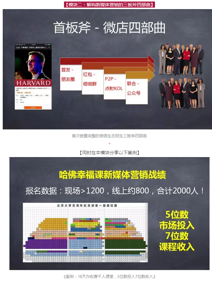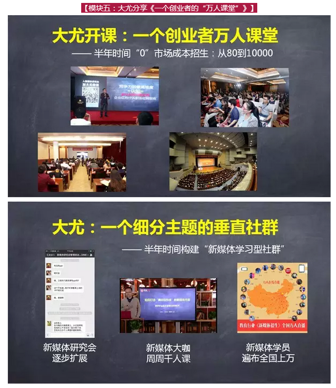 在這次“萬人課堂”上,全天課程內(nèi)容分六大模塊合計300頁P(yáng)PT,包括3個新媒體渠道詳解,3個最新的新媒體載體,6個教育行業(yè)最新新媒體營銷案例,9個視頻。