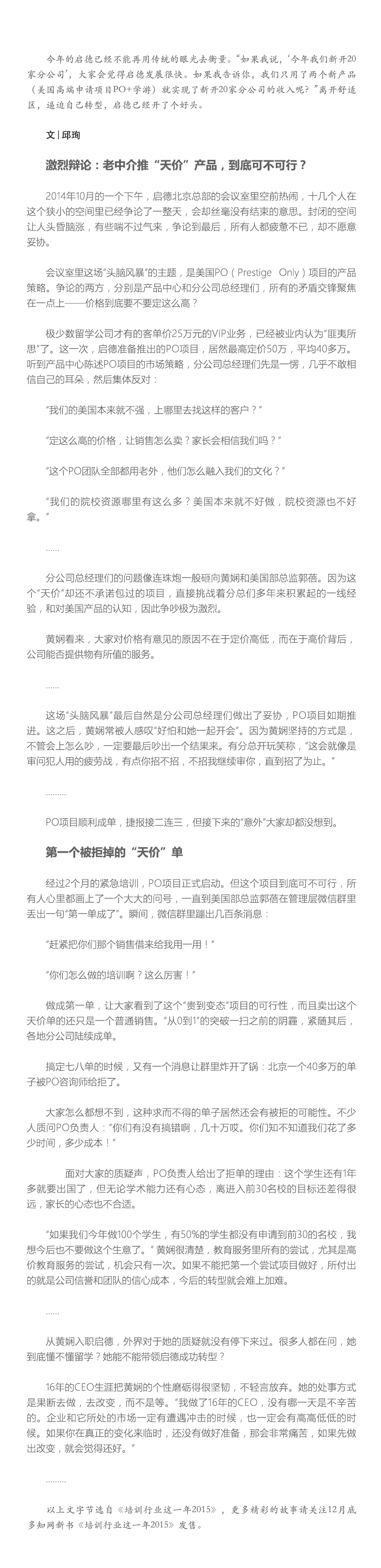 今年的啟德已經(jīng)不能再用傳統(tǒng)的眼光去衡量?!叭绻艺f,‘今年我們新開20家分公司’,大家會覺得啟德發(fā)展很快。如果我告訴你,我們只用了兩個新產(chǎn)品(美國高端申請項目PO+學(xué)游)就實現(xiàn)了新開20家分公司的收入呢?”離開舒適區(qū),逼迫自己轉(zhuǎn)型,啟德已經(jīng)開了個好頭。