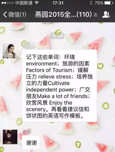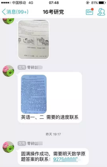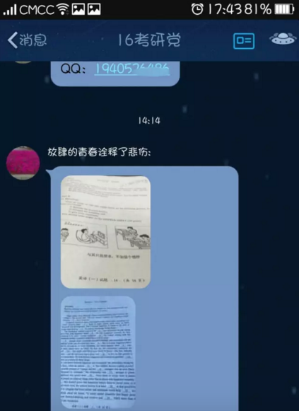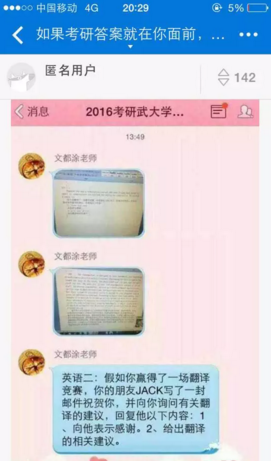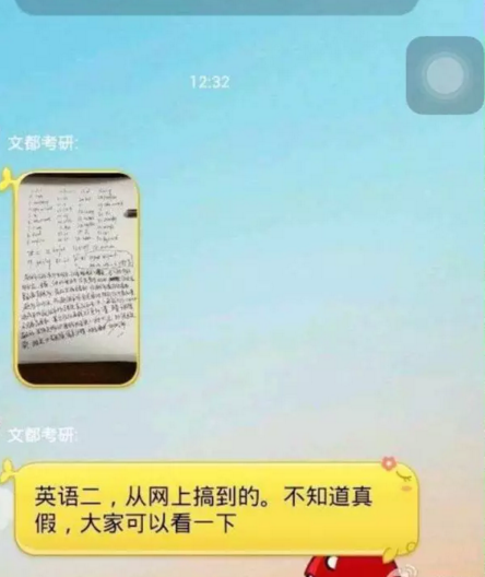本次參加考研的一名同學向南都記者提供的消息截圖顯示,12月26日13點15分,距離14時英語考試開考前,“2016文都考研”QQ群、“燕園2015全xx”微信群、“2016考研武大”QQ群發(fā)布了考研英語(二)大作文、小作文以及作文模板。