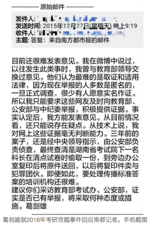 葛劍雄向南都記者透露,2012年考研泄題事件,還是經中央領導指示,由公安部負責偵查,最終查清是湖南省考試院下一名科長在清點試卷時偷取一份,到旁邊辦公室復印后將原件送回,以后將復印件賣與犯罪團伙?!凹幢闳绱?,要處理傳播標準答案的培訓機構還很難?!?/p>
