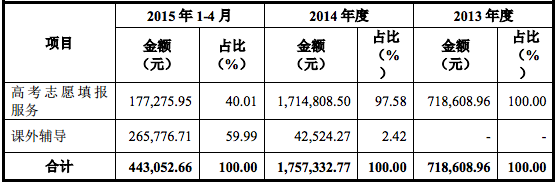 此前,聚智未來的營(yíng)收以高考志愿填報(bào)和線下的課外輔導(dǎo)業(yè)務(wù)為主,2013年度營(yíng)收至2015年4月營(yíng)收以及各業(yè)務(wù)營(yíng)收占比如下表: