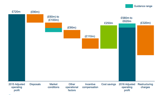 2016年,預(yù)計(jì)營收和運(yùn)營利潤是5.8億英鎊和6.2億英鎊,調(diào)整后的每股收益50-55便士,由于重組后的年收入與2015年的部署帶來的營收損失相抵消,加上在最大的市場里挑戰(zhàn)較多,以及恢復(fù)員工激勵措施和其它操作因素,再排除掉重組的一次性成本,重組后的營收預(yù)計(jì)達(dá)2.6億-3億英鎊。