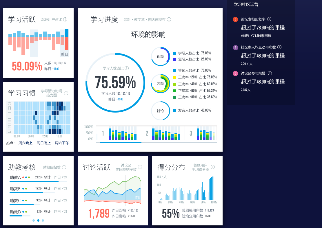 學(xué)堂在線將教師的教學(xué)過程數(shù)字化可視化,幫助教師了解學(xué)生的學(xué)習(xí)計(jì)劃的實(shí)現(xiàn)情況,掌握學(xué)生的訴求,提供教學(xué)決策依據(jù)。教師的系統(tǒng)中可以看到選課人數(shù),學(xué)生活躍度,學(xué)生行為習(xí)慣等。學(xué)生方面,學(xué)堂在線會(huì)根據(jù)學(xué)生學(xué)習(xí)的具體情況,了解學(xué)生的狀態(tài),進(jìn)而根據(jù)數(shù)據(jù)給他們提供學(xué)習(xí)建議。