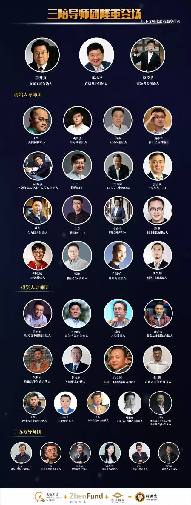 除以上3個主辦方外,群英會還擁有一個70人的導師團及80人的投資人團。在群英會的全程培訓中,創(chuàng)新工場、真格基金、隆領(lǐng)投資主要聯(lián)合創(chuàng)業(yè)導師為參與的創(chuàng)業(yè)者解答如何進行融資估值,關(guān)鍵融資條款有哪些等問題。
