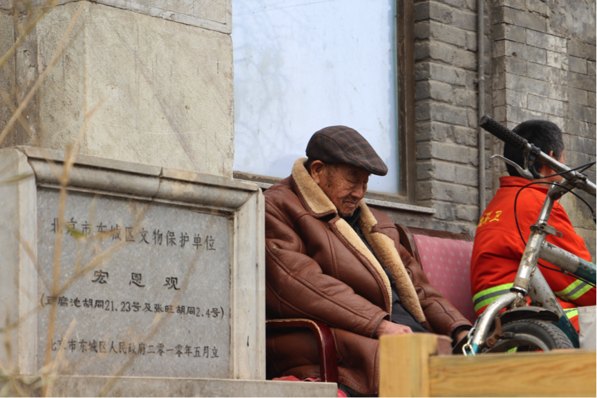 3月初乍暖還寒,北京的霧霾又開始加重。下午兩點,胡同里沒什么人,附近有南鑼鼓巷和后海,鮮有游客走進(jìn)豆腐池胡同。如果不是注意到宏恩觀的石碑,差點走過這座老屋。歲月無聲,卻也留下了印記。