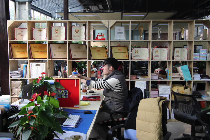 一進(jìn)門是一排榮譽墻,后面的辦公區(qū)非常熱鬧,或者說,很鬧。你身邊隨時有剛面試完的新人拿著簡歷走過,還能聽見團(tuán)隊培訓(xùn)或者負(fù)責(zé)人在重復(fù)某個要點的聲音。