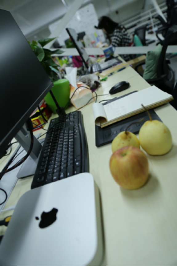 與剛剛經(jīng)過的區(qū)域相比,這片工作區(qū)稍顯冷清。有意思的是,每個人的桌子上都有水果和零食——VIPKID每天會為員工準(zhǔn)備水果。