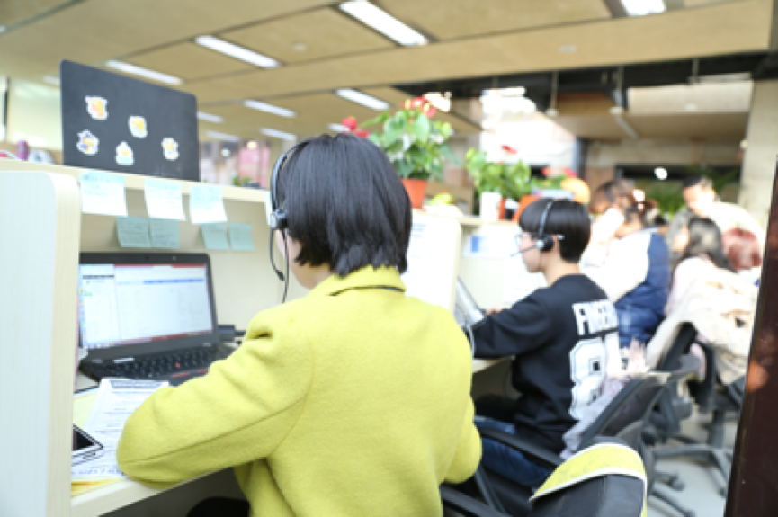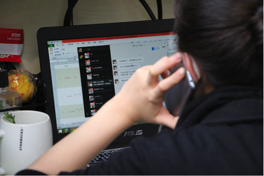 課程顧問一邊打電話一邊回復(fù)微信,微信界面上還有一排等待回復(fù)的人。