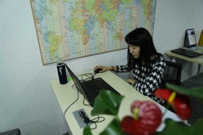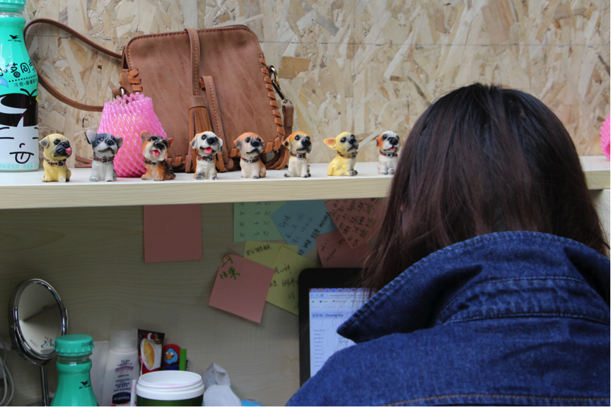每個人的隔斷都會有些個人特色,比如這個姑娘帶了八只狗來上班,給她加油打氣。