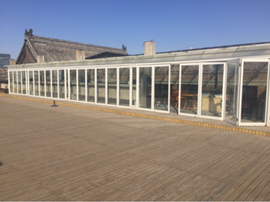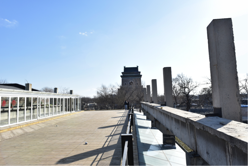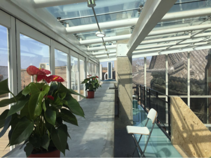 室外陽臺,可以看到鼓樓。后面的屋頂為宏恩觀舊址,VIPKID對道觀的主體建筑進(jìn)行了妥善的保存。