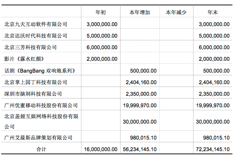 以1999萬(wàn)元投資了以移動(dòng)廣告投放+游戲代理聯(lián)運(yùn)為主要業(yè)務(wù)的廣州優(yōu)蜜移動(dòng)科技股份有限公司,持股0.67%,該公司于2015年11月掛牌新三板;