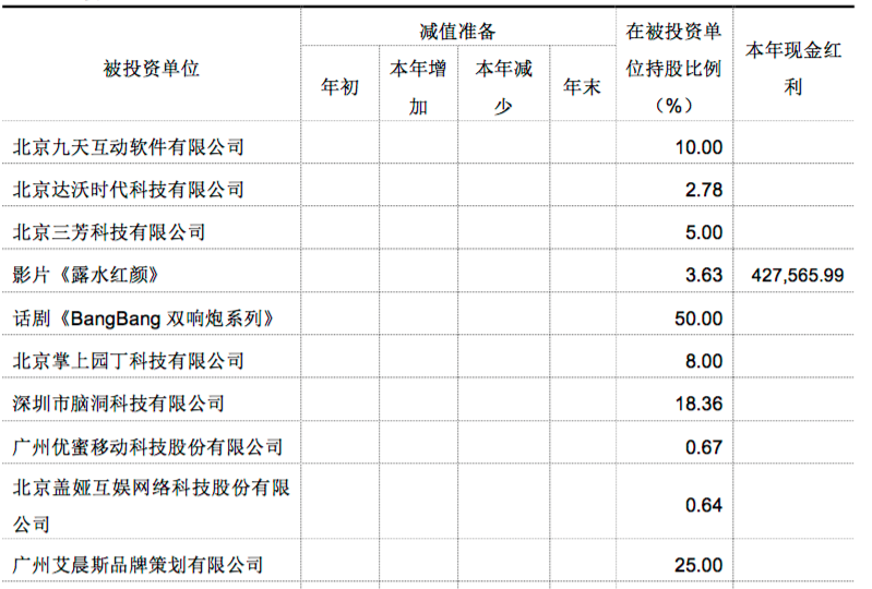以200萬(wàn)元投資電影《露水紅顏》,持股3.63%;