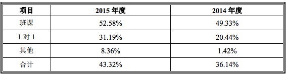 明師教育2014 年及 2015 年的毛利率分別為 36.14%和 43.32%。其中,分服務(wù)類別主要毛利率變化如下:
