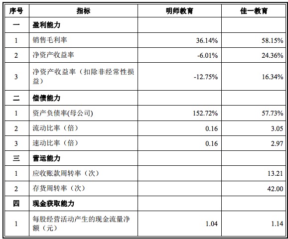 明師教育公告披露了雙方數(shù)據(jù)差距的原因:佳一教育的毛利率大幅高于明師的毛利率,主要原因是佳一教育的業(yè)務(wù)還包括圖書產(chǎn)品銷售和教學(xué)內(nèi)容服務(wù)等毛利率收入;隨著 2015 年收入的大幅增長,明師的毛利率也大幅提升達(dá)到 43.32%。由于明師 2014 年末的凈資產(chǎn)為負(fù),因此凈資產(chǎn)收益率低于佳一教育。由于明師的預(yù)收款項較多導(dǎo)致流動負(fù)債遠(yuǎn)大于流動資產(chǎn),資產(chǎn)負(fù)債率大幅高于佳一教育,速動比率、流動比率較低;通過 2015 年兩次增資后資產(chǎn)負(fù)債率(母公司)降到 57.73%,速動比率、流動比率都提升到 0.91。明師目前的資金主要來自于股東投資,償債能力一般。