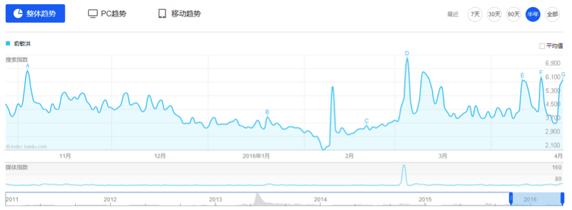下圖為“俞敏洪”搜索詞百度指數(shù)近半年來的變化趨勢: