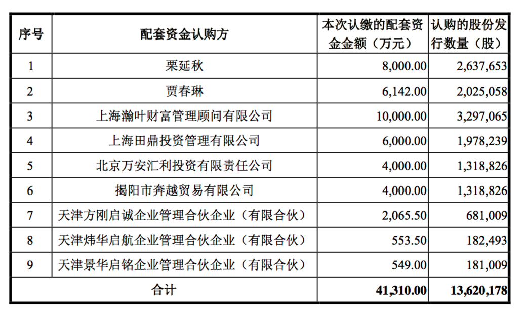 盛通股份擬向栗延秋、賈春琳、上海瀚葉財富管理顧問有限公司、北京萬安 匯利投資有限責任公司、上海田鼎投資管理有限公司、揭陽市奔越貿(mào)易有限公司、天津方剛啟誠企業(yè)管理合伙企業(yè)(有限合伙)、天津煒華啟航企業(yè)管理合伙企業(yè) (有限合伙)、天津景華啟銘企業(yè)管理合伙企業(yè)(有限合伙)非公開發(fā)行股份募 集配套資金,總金額不超過 4.1310億元,總發(fā)行股份數(shù)量不超過 1362萬0178 股。