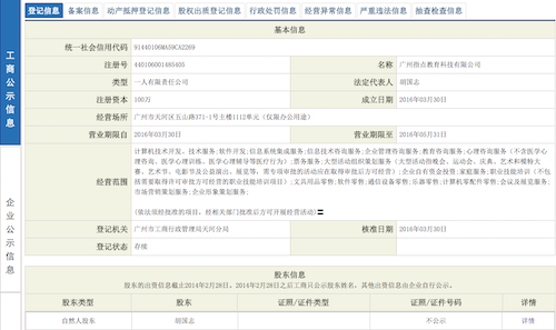 多知網(wǎng)查詢?nèi)珖髽I(yè)信用信息公示系統(tǒng),顯示“私塾家”運(yùn)營主體廣州指點(diǎn)教育科技有限公司成立于2016年3月30日,法人代表胡國志,類型為一人有限責(zé)任公司,且無股權(quán)變更記錄。