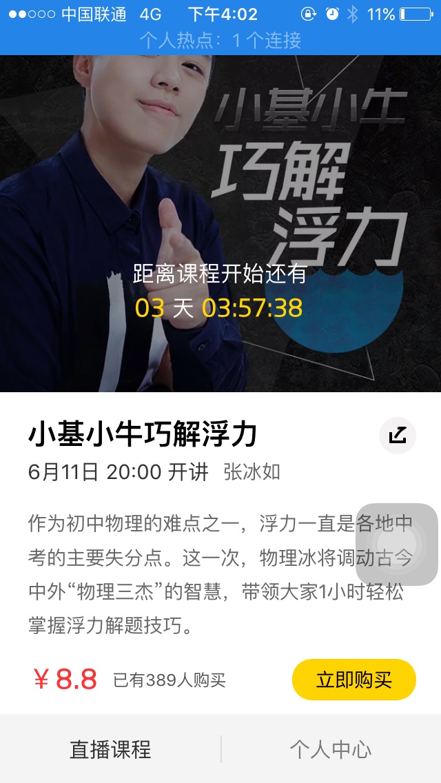 進入叮當課堂APP發(fā)現(xiàn),目前APP的界面還比較簡單,目前分為直播課堂和個人中心兩個菜單,直播課堂只有一個產(chǎn)品,即名為“小基小牛巧解浮力”,售價8.8元。