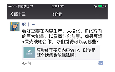 盡管姬十三在朋友圈中沒(méi)有并缺透露未來(lái)的合作企業(yè)和方向,但在微博上,姬十三轉(zhuǎn)發(fā)了一篇以“分答未來(lái)將與豆瓣合作”的文章。