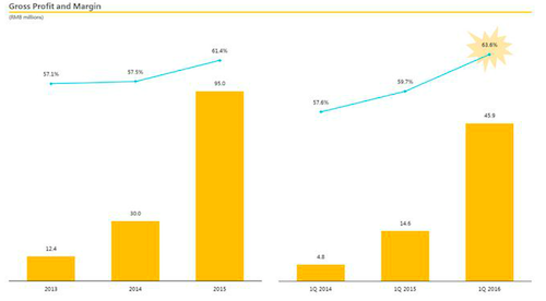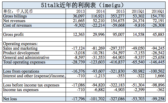 的確,2013-2015年,51Talk的凈營收分別為2166萬、5221萬、1.55億人民幣,凈虧損分別達(dá)到1780萬元、1.117億元、3.271億,其中市場營銷費(fèi)用又分別高達(dá)1712萬、8126萬、2.97億,雖然營收呈現(xiàn)高增長,但營收都不夠市場營銷開支,虧損嚴(yán)重。看了這樣的業(yè)績報(bào)表,對這家公司理論上已經(jīng)沒有多大的研究興趣,但是后來看到公司的早期投資者DCM和紅杉的2000萬美元私募追加認(rèn)購,不僅讓我想起了2012年唯品會的“流血”上市(當(dāng)時(shí)也是DCM和紅杉保駕護(hù)航才成功IPO,后來成為大牛股),于是想花點(diǎn)時(shí)間看一看,而研究這個(gè)公司的聚焦點(diǎn)只有一個(gè):這公司到底能不能賺錢?