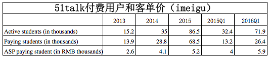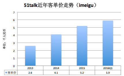 收入項(xiàng)( Gross billings):51Talk的課時(shí)費(fèi)標(biāo)準(zhǔn)是30元人民幣/25分鐘,用戶可購買次卡(最低套餐120次)或者包月卡(最低12個(gè)月起),根據(jù)公司最新的2016年Q1數(shù)據(jù)顯示,該季度的學(xué)費(fèi)收入是1.55億人民幣,付費(fèi)用戶數(shù)是2.64萬,那么平均客單價(jià)即為5900元人民幣。