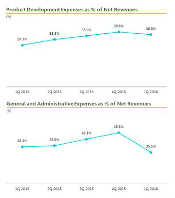 4、產(chǎn)品研發(fā)費(fèi)用/當(dāng)期凈收入、行政管理費(fèi)用/當(dāng)期凈收入在2015年的高企后,2016年Q1迎來下降拐點(diǎn)
