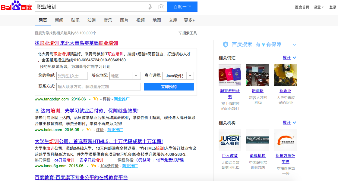 多知網(wǎng)在百度中搜索“職業(yè)培訓(xùn)”后,首頁搜索欄顯示下有3條商業(yè)推廣信息,右邊欄中的“相關(guān)機(jī)構(gòu)”中仍有培訓(xùn)機(jī)構(gòu)的品牌顯示。
