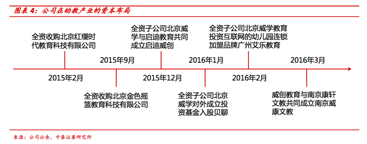 自2014年和君系開始進入公司,對威創(chuàng)股份的累積持股比例已經(jīng)接近15%,在和君不斷為公司導(dǎo)入和輸送教育相關(guān)人才的同時,也為公司注入資本運作的血液,推動公司走上內(nèi)生與外延相結(jié)合的發(fā)展道路。自2015年開始,公司開啟了在幼教產(chǎn)業(yè)的資本運作之路,在2015年2月和9月分別收購了國內(nèi)知名的幼兒園連鎖品牌紅纓教育和金色搖籃,同時自2016開始,分別投資了貝聊,并與啟迪教育和南京康軒成立合資公司,開啟了在家園互動、內(nèi)容研發(fā)以及幼師培訓(xùn)方面的布局。