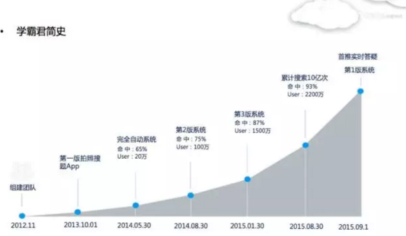 等到第一版上線(xiàn)的時(shí)候,我們發(fā)現(xiàn),用了一大堆非常裸、非常的低效的平平手段創(chuàng)造出來(lái)的OCR加搜題的模塊,能夠達(dá)到百分之四十幾的搜索命中率。我們覺(jué)得這個(gè)東西有戲。在那個(gè)之后,我們逐步迭代各種版本,到現(xiàn)在已經(jīng)發(fā)布了三個(gè)主要的文字識(shí)別版本,大概是93%左右的搜索命中率。到目前累計(jì)搜索接近20億次。每一道題的搜索,后面緊密連接一個(gè)電話(huà)號(hào)碼,就是學(xué)生注冊(cè)的時(shí)候填寫(xiě)的電話(huà)號(hào)碼。這有什么用呢?等一下我會(huì)跟大家分享一下。
