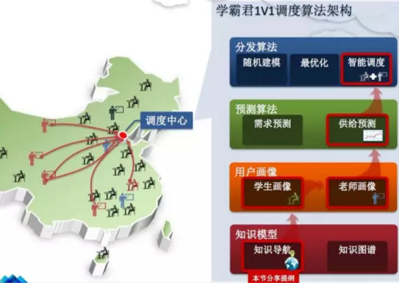 隱藏的技術(shù)就由這個(gè)架構(gòu)體現(xiàn)。最底層的是知識(shí)模型,包括知識(shí)導(dǎo)航、知識(shí)圖譜。往上一層,包括學(xué)生畫(huà)像跟老師畫(huà)像兩塊的用戶(hù)畫(huà)像,當(dāng)然家長(zhǎng)畫(huà)像也是非常重要的。還有第三個(gè),往上走就是預(yù)測(cè)算法。因?yàn)楣┬桕P(guān)系必須平衡,不平衡會(huì)導(dǎo)致整個(gè)系統(tǒng)崩潰,所以這塊也是非常重要的。最上面是偏運(yùn)籌學(xué)方面的工作,需要對(duì)老師的需求跟供應(yīng)進(jìn)行建模,然后做最優(yōu)化、智能的調(diào)度。