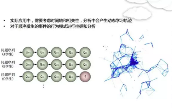 這張圖給大家看一下我們怎么去分析學(xué)生的共性,怎么去用這種拍照搜題數(shù)據(jù)。每個(gè)學(xué)生在系統(tǒng)里面呈現(xiàn)出很多的數(shù)據(jù),這個(gè)數(shù)據(jù)就是我們非常大的財(cái)富,然后不斷去挖掘里面隱含的信息。首先用剛才說(shuō)的那個(gè)GPS系統(tǒng),就是知識(shí)的建模,把每一個(gè)題目的知識(shí)點(diǎn)抽樣出來(lái),變成一個(gè)輸入,接上時(shí)間軸,把它扔進(jìn)一個(gè)深度神經(jīng)網(wǎng)絡(luò),這時(shí)候就可以抽取學(xué)生的各種特征。然后接下去,我們可以做一些分析。
