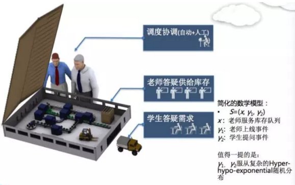 生產(chǎn)系統(tǒng)里面基本上有三個(gè)主要角色。首先是協(xié)調(diào)管理和調(diào)度的人員,我們現(xiàn)在是用95%的自動(dòng)化加5%的人工去進(jìn)行協(xié)調(diào)管理,其目的就是為了調(diào)整老師跟學(xué)生之間的匹配關(guān)系。老師答疑的供應(yīng),可類(lèi)比為庫(kù)存,整個(gè)系統(tǒng)不斷生產(chǎn),老師會(huì)不斷出來(lái),如果庫(kù)存積壓的話(huà),有庫(kù)存成本。