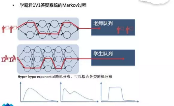 我們把它建成一個(gè)Markov過(guò)程,這是實(shí)實(shí)在在放在后臺(tái)調(diào)度的一個(gè)模塊。然后可以把Markov過(guò)程想象成為狀態(tài)機(jī),有不同的狀態(tài),每個(gè)狀態(tài)可以互相跳變,但是這個(gè)跳變有一定的概率。我們可以去模擬各種各樣稀奇古怪的分布,老師的分布不一定是正態(tài)分布或者指數(shù)分布那樣工正,可能是雙峰值、后尾的等。為了預(yù)測(cè)比較好的準(zhǔn)確度,用了非常特殊的一個(gè)分布區(qū)域?qū)λM(jìn)行建模。