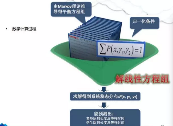 建模之后,我們就可以做隊(duì)列的模型。老師進(jìn)來(lái),服從這樣一個(gè)Markov過(guò)程,學(xué)生到來(lái),服從另外一個(gè)Markov過(guò)程,它的參數(shù)是不一樣的。學(xué)生過(guò)來(lái)之后,如果有老師在等待隊(duì)列里面,他們就可以匹配,形成服務(wù)的一個(gè)對(duì)接,這就是一個(gè)好的開(kāi)始。有了剛才Markov過(guò)程,接下去就是列出一大堆平衡方程,總共大概有幾十萬(wàn)到一百萬(wàn)的平衡方程,基本上是描述各種狀態(tài)之間的跳變。