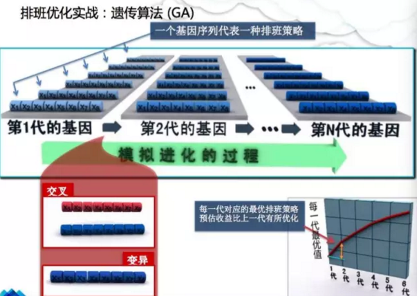 簡(jiǎn)言之,我們現(xiàn)在用了遺傳算法在做在線(xiàn)的優(yōu)化。遺傳算法簡(jiǎn)單時(shí)顯,實(shí)際上就是通過(guò)不斷的迭代、計(jì)算,把一些解不斷優(yōu)化,X1、X2、X3到X8就代表著每一個(gè)時(shí)間的一個(gè)片斷的一個(gè)排單量,然后通過(guò)兩種算子,一種是交叉,一種是編譯,不斷去形成更優(yōu)的排班。迭代很多次計(jì)算之后,總體的收益函數(shù)會(huì)不斷上升,直到比較好的結(jié)果。這個(gè)就是我們最終的排班策略。