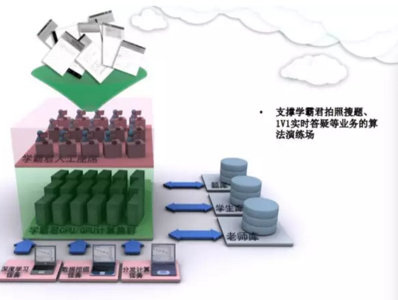 第四個(gè),是智能版面分析引擎。接下去我們要做的事情會(huì)更有意思。所有的卷子、書(shū)籍,首先可以做校正,然后會(huì)做智能化的切割,一道題一道題切割出來(lái)。如果這道題是可以解的,那我們給它解出來(lái),如果這道題是數(shù)據(jù)庫(kù)有的,我們從數(shù)據(jù)庫(kù)搜索出來(lái)。每道題的頻次、考分、重要性全部分析出來(lái)。然后所有學(xué)習(xí)數(shù)據(jù),就可以幫助學(xué)生去更精準(zhǔn)投放時(shí)間,避免時(shí)間浪費(fèi)。我們通過(guò)圖像的切片,可以把整個(gè)任務(wù)切成一小塊一小塊,然后分發(fā)給圖像的云處理機(jī)群,做并發(fā)處理,最后把它拼接成綜合的結(jié)果,發(fā)送給相應(yīng)的處理終端。這個(gè)是我們?cè)频募軜?gòu)。