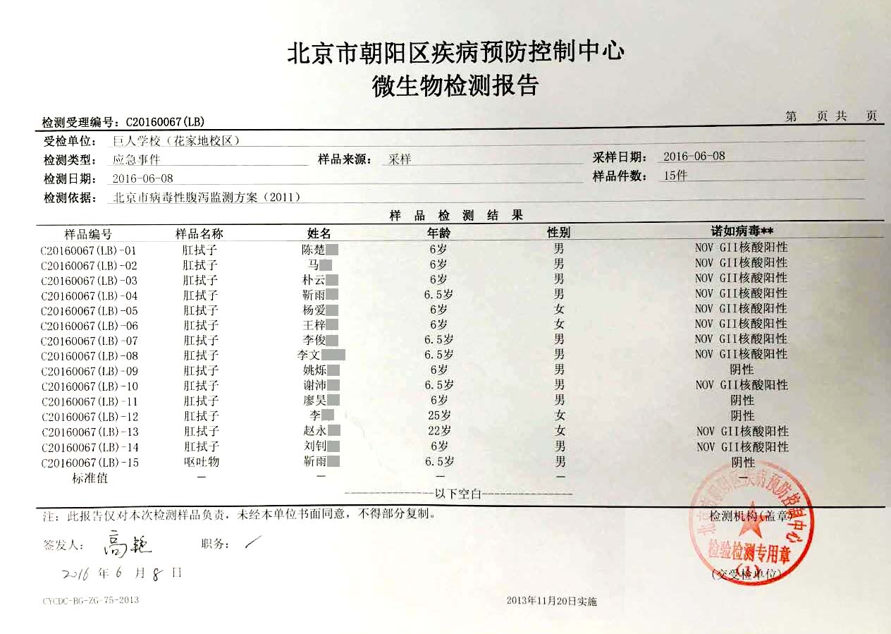 朝陽疾控中心對學生嘔吐物進行了檢測。檢測報告顯示,證實學生嘔吐原因為諾如病毒感染。