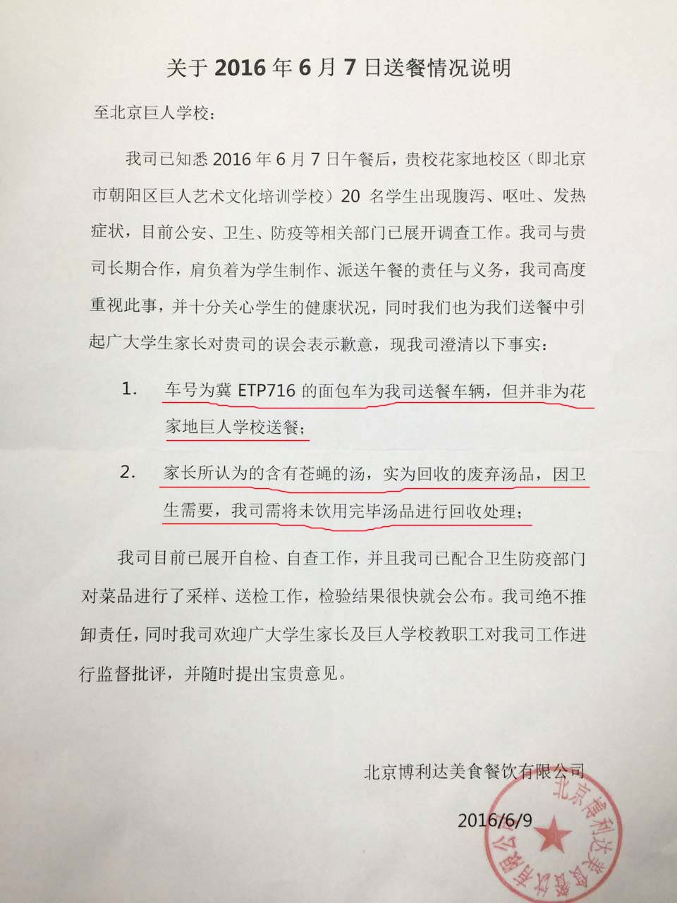 關于合作的送餐公司,小巨人稱,全部送餐公司均有集團統(tǒng)一招標選擇,選擇的餐飲公司資質(zhì)齊全,本次花家地的送餐公司為北京博利達美食餐飲有限公司,目前小巨人已經(jīng)和對方終止合作。