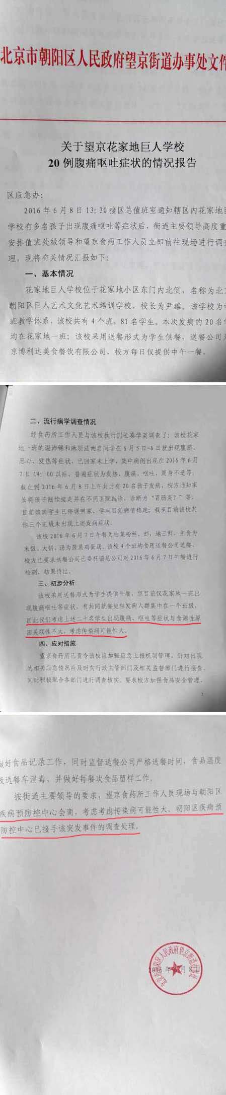 望京街道辦事處調(diào)研情況匯報中稱,接到區(qū)總值班室通知后,安排值班處級領導和王晶食藥工作人員前往現(xiàn)場調(diào)查處理。根據(jù)現(xiàn)場調(diào)查情況,上述20名學生出現(xiàn)腹痛、嘔吐等癥狀與食源性原因關聯(lián)性不大,考慮傳染病可能性大。朝陽區(qū)疾病預防控中心已經(jīng)接手該突發(fā)事件的調(diào)查處理
