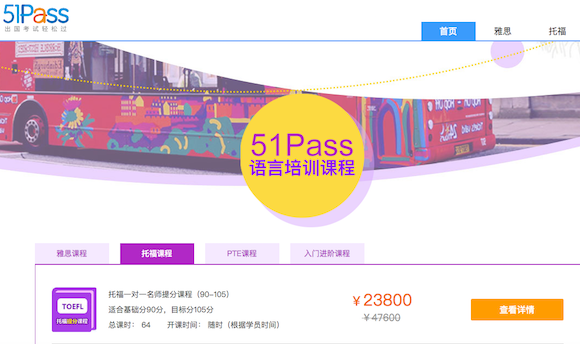 51pass的產(chǎn)品分為托福課程、雅思課程、PTE課程和入門進(jìn)階課程,形式以一對(duì)一為主,每個(gè)大類之下按照學(xué)生目前的水平和目標(biāo)分為多個(gè)產(chǎn)品,均價(jià)為每小時(shí)200-250元,入門課程價(jià)格在每小時(shí)150元左右。