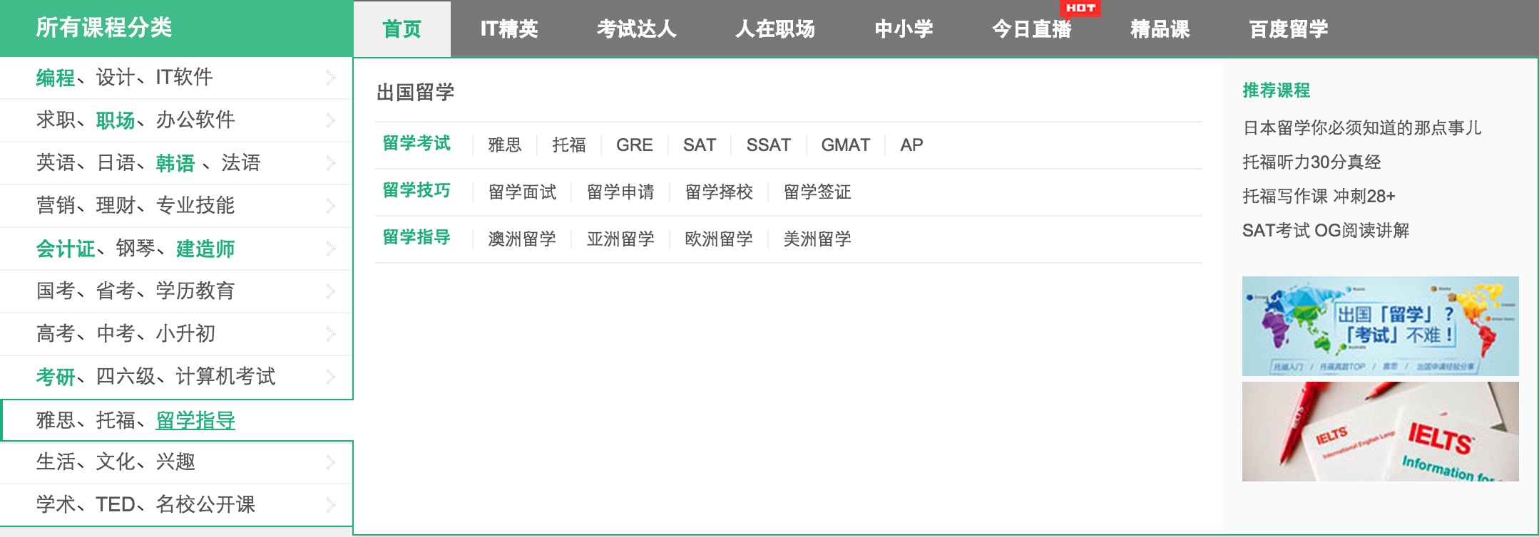 在上線百度留學(xué)頻道之前,百度傳課的課程分類中包含了“留學(xué)指導(dǎo)”一項,具體內(nèi)容包括“留學(xué)申請”、“留學(xué)擇?!薄ⅰ傲魧W(xué)面試”等。