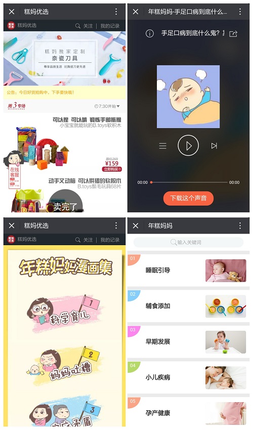 微信公眾號(hào)“年糕媽媽”主要為年輕媽媽們提供育兒及相關(guān)資訊。從2014年7月剛開(kāi)始推出到現(xiàn)在的兩年時(shí)間里,“年糕媽媽”陸續(xù)發(fā)布了近500篇文章,每篇文章平均閱讀量在10萬(wàn)以上,最高達(dá)200萬(wàn)。目前,“年糕媽媽”微信公眾號(hào)粉絲數(shù)為500萬(wàn)。