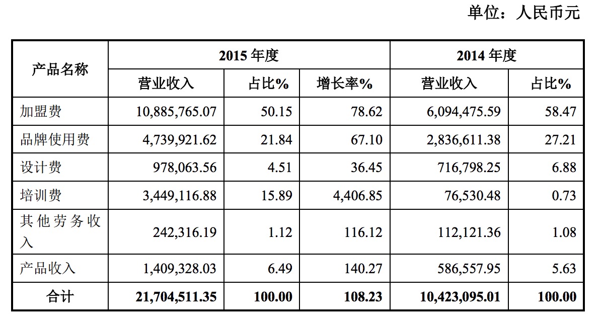 公告顯示,2015年偉才教育加盟費(fèi)為1088.5萬元,品牌使用費(fèi)為473.9萬元,設(shè)計費(fèi)為97.8萬元,培訓(xùn)費(fèi)為344.9萬元,其它勞務(wù)費(fèi)為24.2萬元,產(chǎn)品收入為140.9萬元。