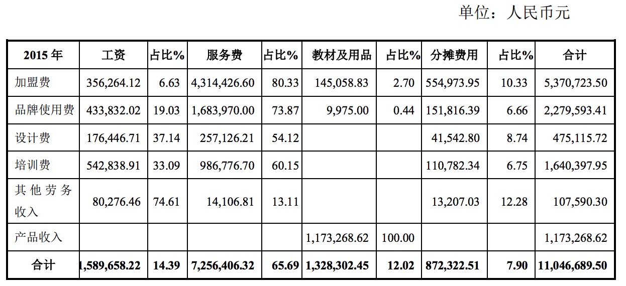 公告顯示,加盟費(fèi)中,公司 2014 年度的工資和服務(wù)費(fèi)占總營業(yè)成本的比例與 2015 年度持平,分別為79.01%和86.97%;其中外部機(jī)構(gòu)的服務(wù)費(fèi)占比 2014 年度與 2015年度分別為 64.70%和 80.33%。品牌使用費(fèi)中,公司 2014 年度的工資和服務(wù)費(fèi)占總營業(yè)成本的比例與 2015 年度持平,分別為 89.60%和 92.90%,其中外部機(jī)構(gòu)的服務(wù)費(fèi)占比 2014 年度與 2015 年度分別為 47.14%和 73.87%。