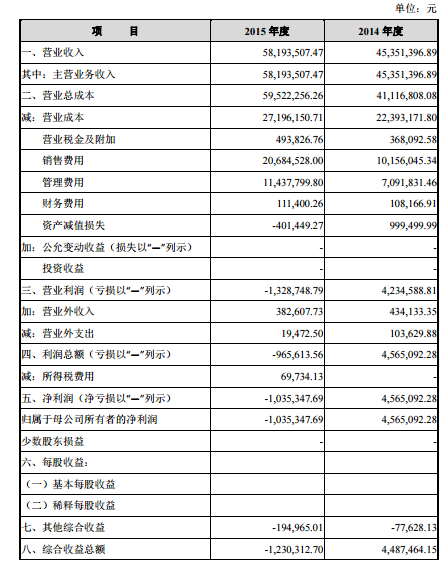遠播教育 2014 年和 2015 年的主營業(yè)務收入分別為 4535.14 萬元和 5819.35 萬元,凈利潤分別為為456.51萬元和-103.53萬元。